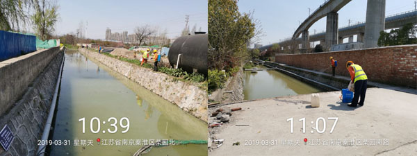秦淮區(qū)果園河水體黑臭應急治理工程,于2019年3月29日啟動。果園河應急治理周期為30日歷天治理期內(nèi),采用RhP體系技術(shù),運用多種實施措施,僅3天水體臭味消除、水色轉(zhuǎn)為綠色、透明度提升到清澈見底。至4月10日,果園河水生態(tài)系統(tǒng)正在良性發(fā)展,水生態(tài)多樣性開始呈現(xiàn)、水質(zhì)指標氨氮下降至5.0mg/L以下、溶解氧提升至4.0mg/L以上。