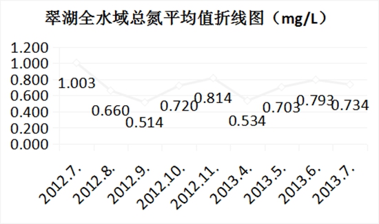 翠湖水域2013年7月總氮均值為0.73mg/L,2012年7月總氮均值為1.003mg/L,2013年與2012年同期相比,翠湖水域總氮削減了27.22%;??????