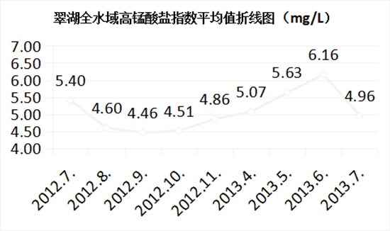 翠湖水域2013年7月高錳酸鹽指數(shù)均值為:4.96mg/L,2012年7月高錳酸鹽指數(shù)均值為:5.4mg/L ,2013年與2012年同期相比,翠湖水域高錳酸鹽指數(shù)下降:8.15%;