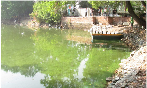 西河入水口,入水中含大量藍(lán)藻(水呈綠色)