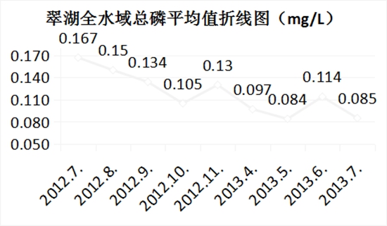 翠湖水域2013年7月總磷均值為0.085mg/L,2012年7月均值為0.167mg/L , 2013年與2012年同期相比,翠湖水域總磷削減了49.1%;
